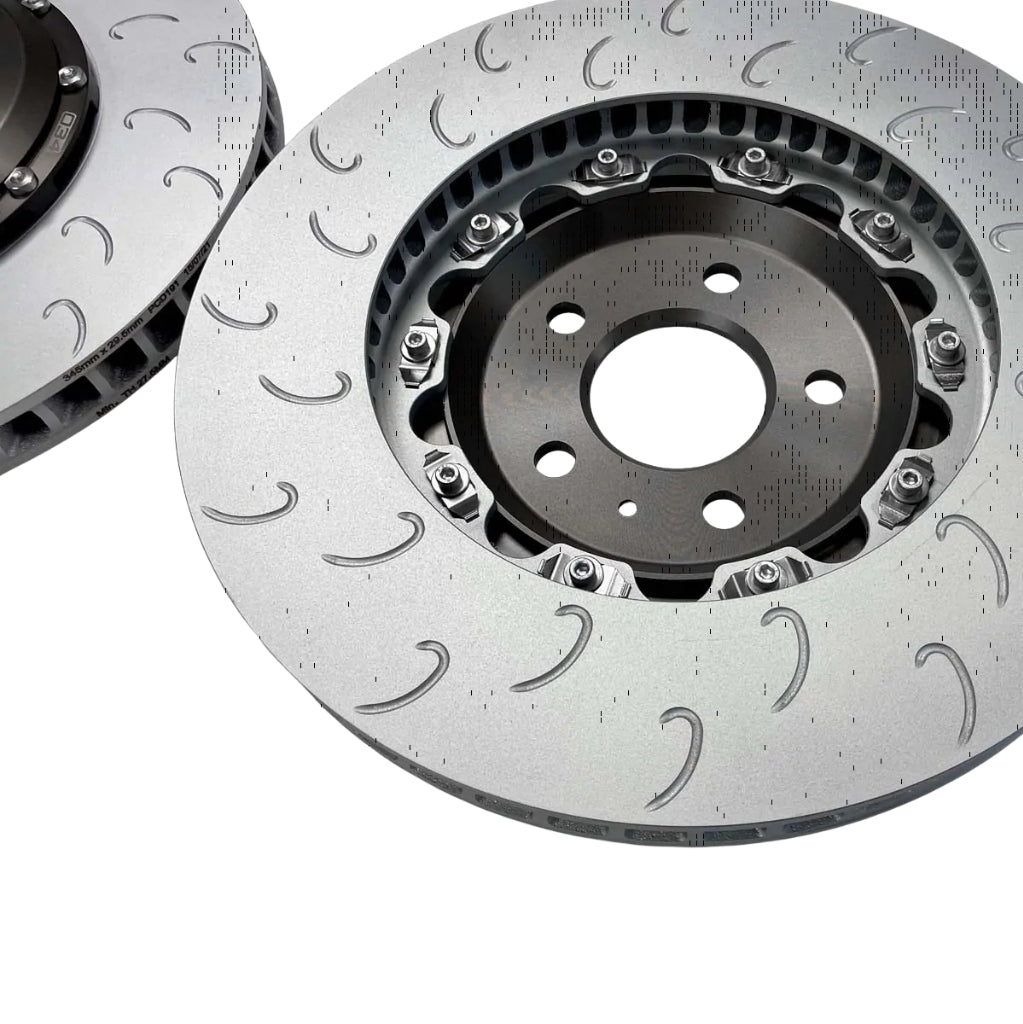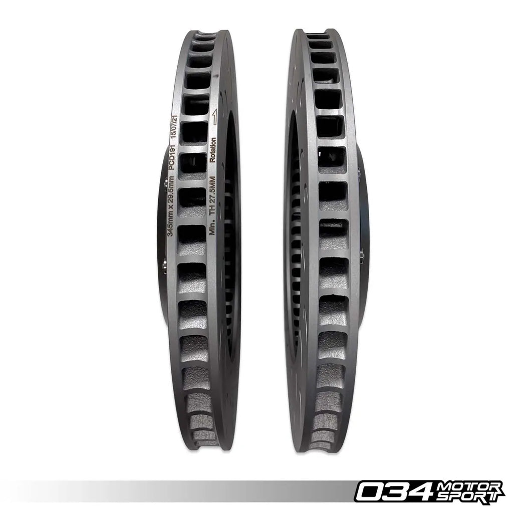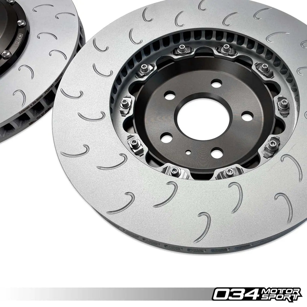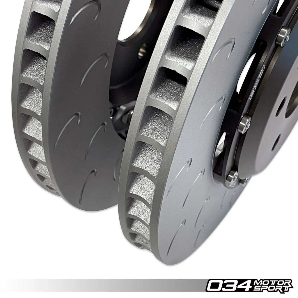 IL Kit di aggiornamento del disco freno 034 Motorsport da 345 mm x 30 mm in 2 pezzi è progettato per gli appassionati di auto che vogliono migliorare le prestazioni di frenata della loro Audi B8 e B8.5 S4/S5/Q5 Vuoi migliorare? Questi dischi ad alte prestazioni sono un kit di sostituzione completo che si integra perfettamente con le pinze di fabbrica. Con un peso di circa 19,00 libbre (circa 8,62 kg) per disco, sono significativamente più leggeri dei dischi originali di fabbrica, pari a circa 24,10 libbre (circa 10,95 kg), con una conseguente riduzione di 5,10 libbre del peso rotazionale per curva. Ciò riduce la massa ininterrotta, migliorando le prestazioni generali di maneggevolezza e la reattività dei freni in accelerazione. I dischi sono realizzati in una lega unica che resiste ad alte temperature e pressioni estreme, garantendo affidabilità anche in condizioni di guida intense. Il coprimozzo è realizzato in alluminio aeronautico 6061-T6, che contribuisce alla loro durata e al design leggero. Dotato di 72 lame curve direzionali al posto delle tradizionali lame dritte, questo aggiornamento offre un significativo miglioramento del flusso d'aria e della dissipazione del calore, fondamentali per mantenere le prestazioni di frenata sotto carichi pesanti.