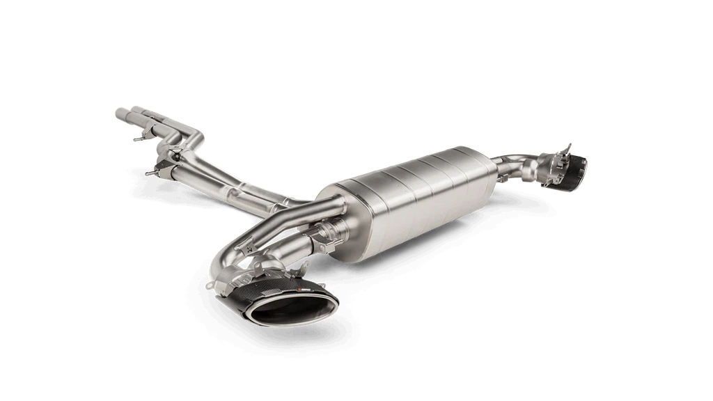 Questo sistema di scarico splendidamente realizzato trasuda sound e prestazioni. Realizzato interamente in titanio leggero e ad alta resistenza, è dotato di un silenziatore centrale affiancato da due valvole e di un tubo di collegamento con elemento di collegamento a X. Le esclusive sonorità offrono il massimo piacere di guida, con la caratteristica nota racing ad alta frequenza Akrapovič agli alti regimi, completata dal profondo e iconico rombo Akrapovič ai bassi regimi, che si traduce nel caratteristico ruggito del V8. È disponibile anche una modalità comfort che elimina rumori o ronzii indesiderati nell'abitacolo. Completa il tutto con straordinari terminali di scarico in fibra di carbonio/titanio su entrambi i lati della parte posteriore dell'auto. Aumenta inoltre la potenza di 6,9 kW a 5600 giri/min e aggiunge 17,2 Nm di coppia a 2500 giri/min. È un prodotto plug-and-play e non richiede alcuna modifica alla centralina grazie all'omologazione ECE.